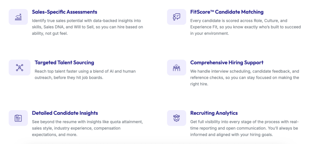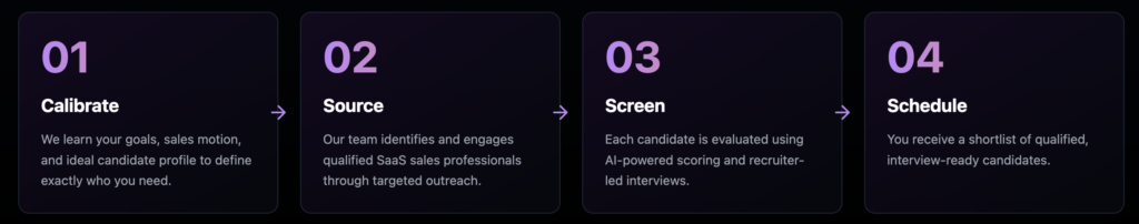 Besides that, your SaaS company gets to leverage access to cutting-edge AI sales recruiting technology and a dedicated team that knows your culture inside and out and delivers candidates who align with it.