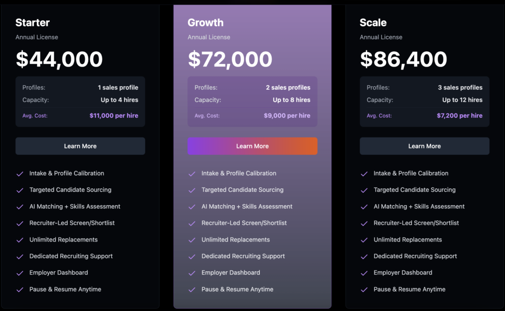 Even the most expensive Scale plan, which offers three sales profiles and up to 12 hires, costs $86,400, which is still much less than the cost of hiring one full-time in-house recruiter.